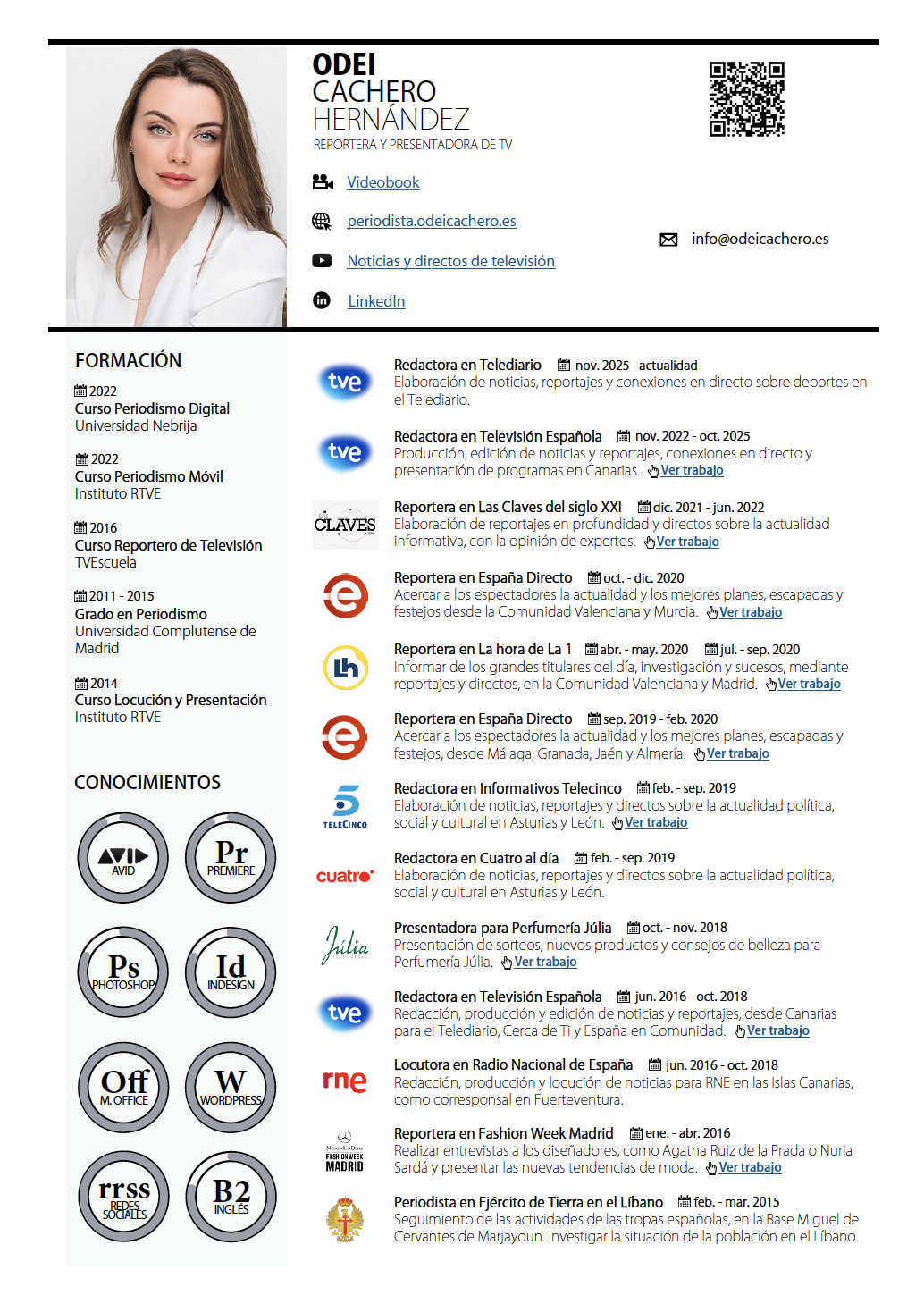 Odei Cachero Periodista Reportera Presentadora Televisión TV Web Contacto Directo Reportaje Noticia CV Currículum Videobook Video Videos Trabajos Freelance Correo Entretenimiento Informativo Cámara Foto Book TVE RTVE Telecinco Cuatro Mediaset Madrid España Barcelona Asturias País Vasco Mujer Española YouTube Vimeo Periodismo Política Cultura Ocio Informadora Entrevista Edad Instagram Facebook Biografía España Directo Telediario La 1 Documentales